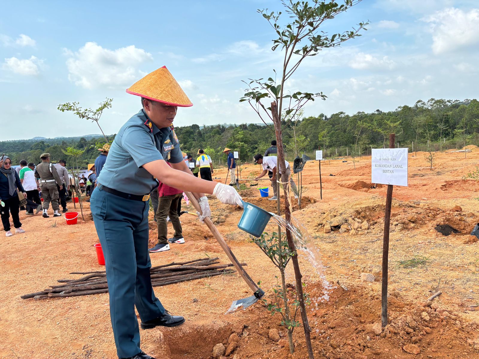 TNI AL, Bintan,- Bertempat di Embung DAS Kawal, Toapaya, Bintan, Komandan Lanal Bintan Kolonel Laut (P) Dr. Eko Agus Susanto, S.E., M.M., turut serta dalam Penanaman Pohon Kegiatan Rehabilitasi Lahan di Kabupaten Bintan Tahun 2025 disejalankan dengan Kegiatan Dana Bagi Hasil Sawit, bersama Bupati Bintan, Selasa (22/07/2025).
