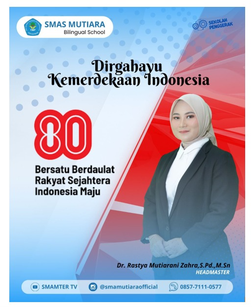 “Dirgahayu Republik Indonesia ke-80! 80 tahun Indonesia merdeka, 80 tahun perjuangan diteruskan oleh generasi muda. Mari kita isi kemerdekaan dengan prestasi, dedikasi, dan semangat kebangsaan yang tidak pernah padam. Di SMA Mutiara, kami tidak hanya mendidik, tapi juga membentuk karakter. Kami siap melahirkan generasi unggul yang berakhlak, berprestasi, dan berjiwa nasionalis untuk Indonesia yang Maju, Sukabumi Mubarokah, jabar Istimewa, semua akan lebih baik,” ungkap Rastya, Minggu 17 Agustus 2025.