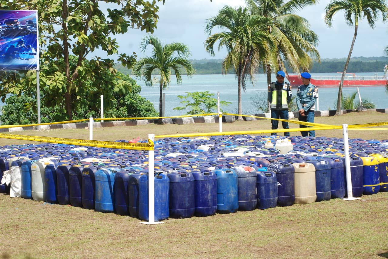 Jerigen berukuran 30 liter sebanyak 20 buah dengan jumlah 600 liter, Jerigen berukuran 35 liter sebanyak 374 buah dengan jumlah 13.090 liter. Selain itu, juga diamankan Kapal Nelayan KM. El Shaday dan KM. Bersyukur, serta 2 (dua) Nahkoda Kapal dan 21 Penumpang sekaligus pemilik barang.