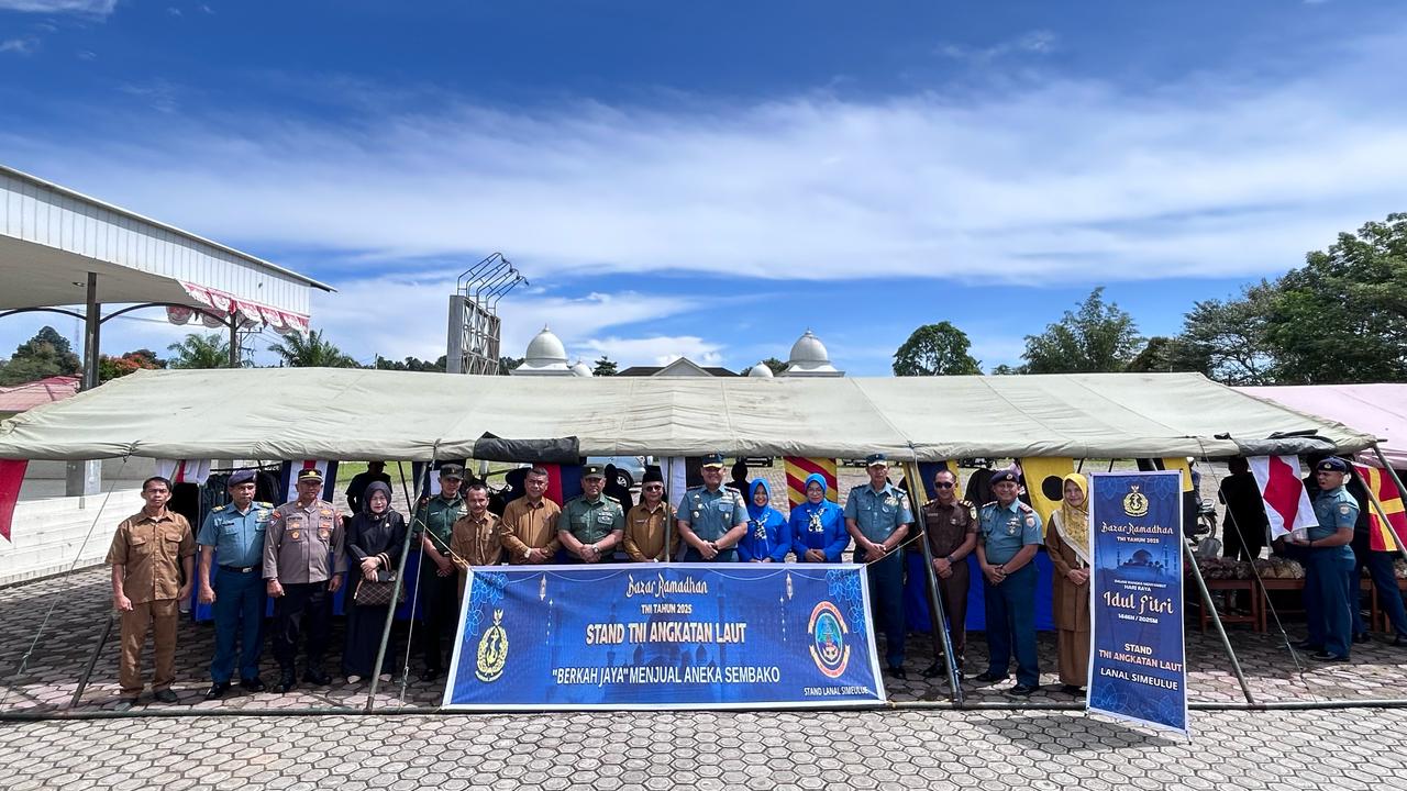 TNI AL, Simeulue,- Dalam rangka menyambut Hari Raya Idul Fitri 1446 H/2025 M, Pangkalan TNI AL Simeulue berkolaborasi bersama Kodim 0115/Simeulue dan Pemerintah Daerah menggelar kegiatan Bazar TNI yang bertujuan untuk membantu masyarakat mendapatkan kebutuhan pokok dengan harga terjangkau, Selasa (25/3/2025).