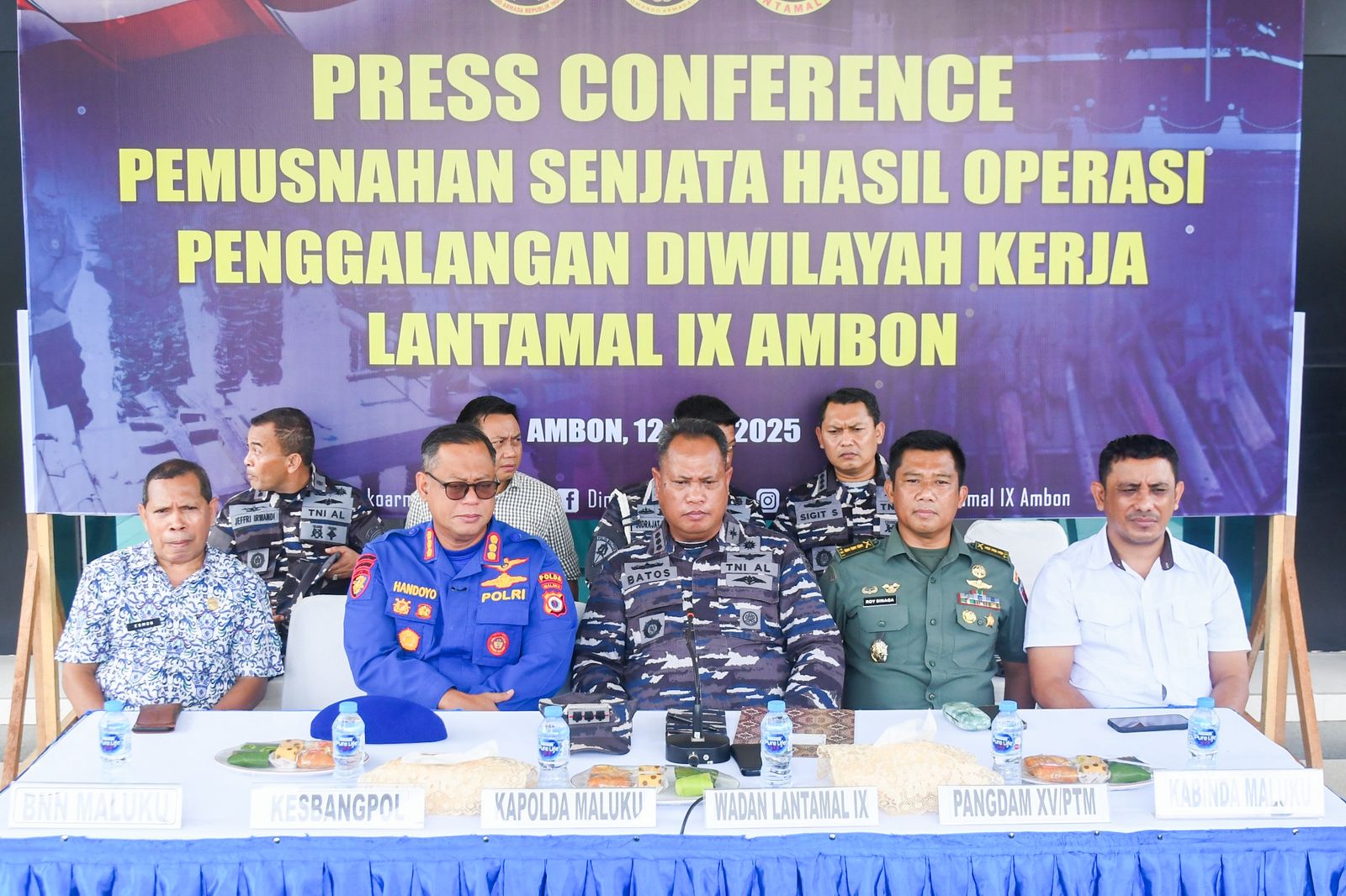 Lantamal IX Ambon menggelar press conference pemusnahan puluhan senjata hasil operasi penggalangan di wilayah kerja Lantamal IX. Operasi penggalangan ini diperoleh dari masyarakat di wilayah Maluku yang secara sukarela menyerahkan senjata hasil rakitan ke Tim Intelijen wilayah Lantamal IX Ambon.