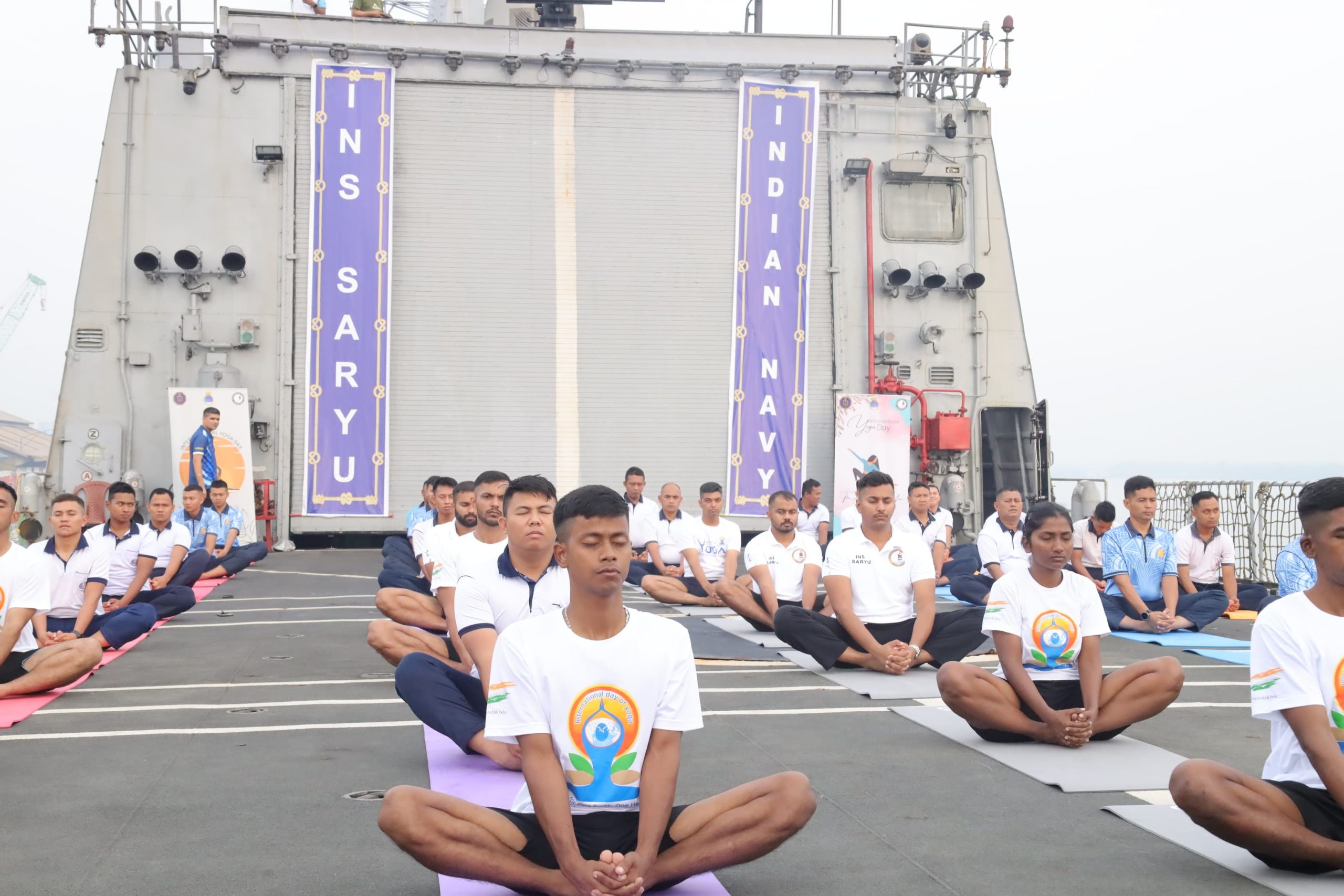 TNI AL, Belawan,- Personel Pangkalan Utama TNI Angkatan Laut I (Lantamal I) melaksanakan olahraga bersama Senam Yoga dengan ABK Kapal Perang India INS Saryu P54, bertempat di Deck Kapal dan Dermaga Pelindo 104 Belawan, Sumatera Utara, Sabtu (21/6/2025).