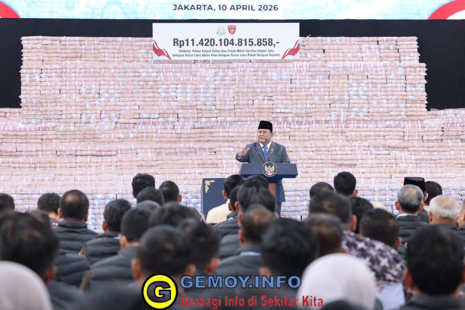 Pada Jumat (10/4) ini, Kejaksaan Agung menyerahkan pengenaan denda administratif dan pemulihan kerugian akibat aktivitas ilegal di dalam kawasan hutan sebesar Rp 11,42 triliun yang disaksikan Prabowo. Ini merupakan hasil penindakan periode Januari-April 2026 yang berasal di antaranya dari denda administratif, PNBP penanganan tindak pidana korupsi, setoran pajak, dan PNBP denda lingkungan hidup.