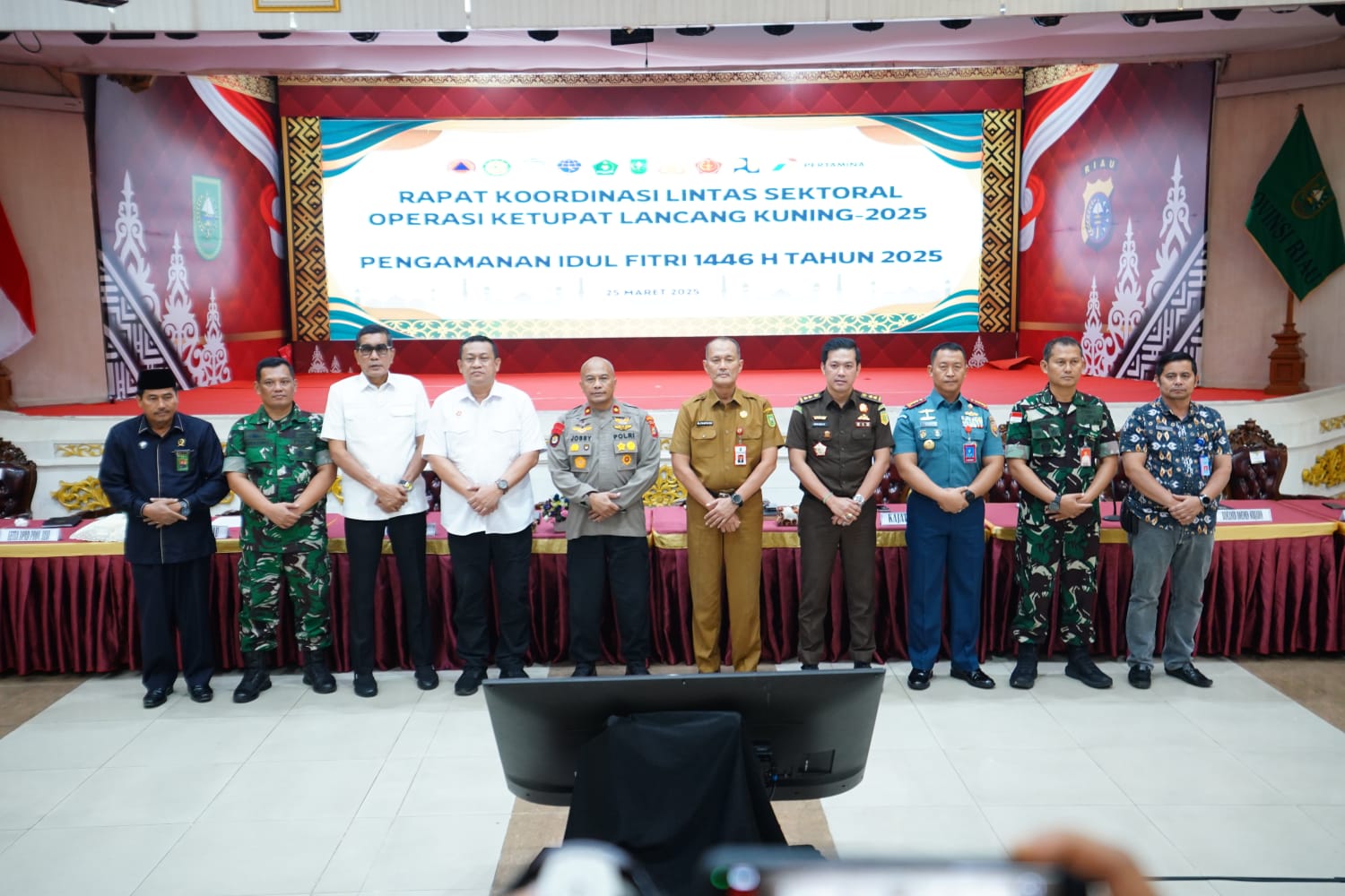 TNI AL, Dumai,- Dalam upaya meningkatkan sinergitas dan koordinasi antar instansi, Komandan Lanal Dumai Kolonel Laut (P) Abdul Haris didampingi Dandenpom Lanal Dumai Mayor Laut (PM) Syaparudin menghadiri Rapat Koordinasi Lintas Sektoral Operasi Ketupat Lancang Kuning 2025, bertempat di Balai Serindit Aula Gubernuran Provinsi Riau, Jalan Diponegoro No. 23 Pekanbaru, Selasa (25/03/2025).