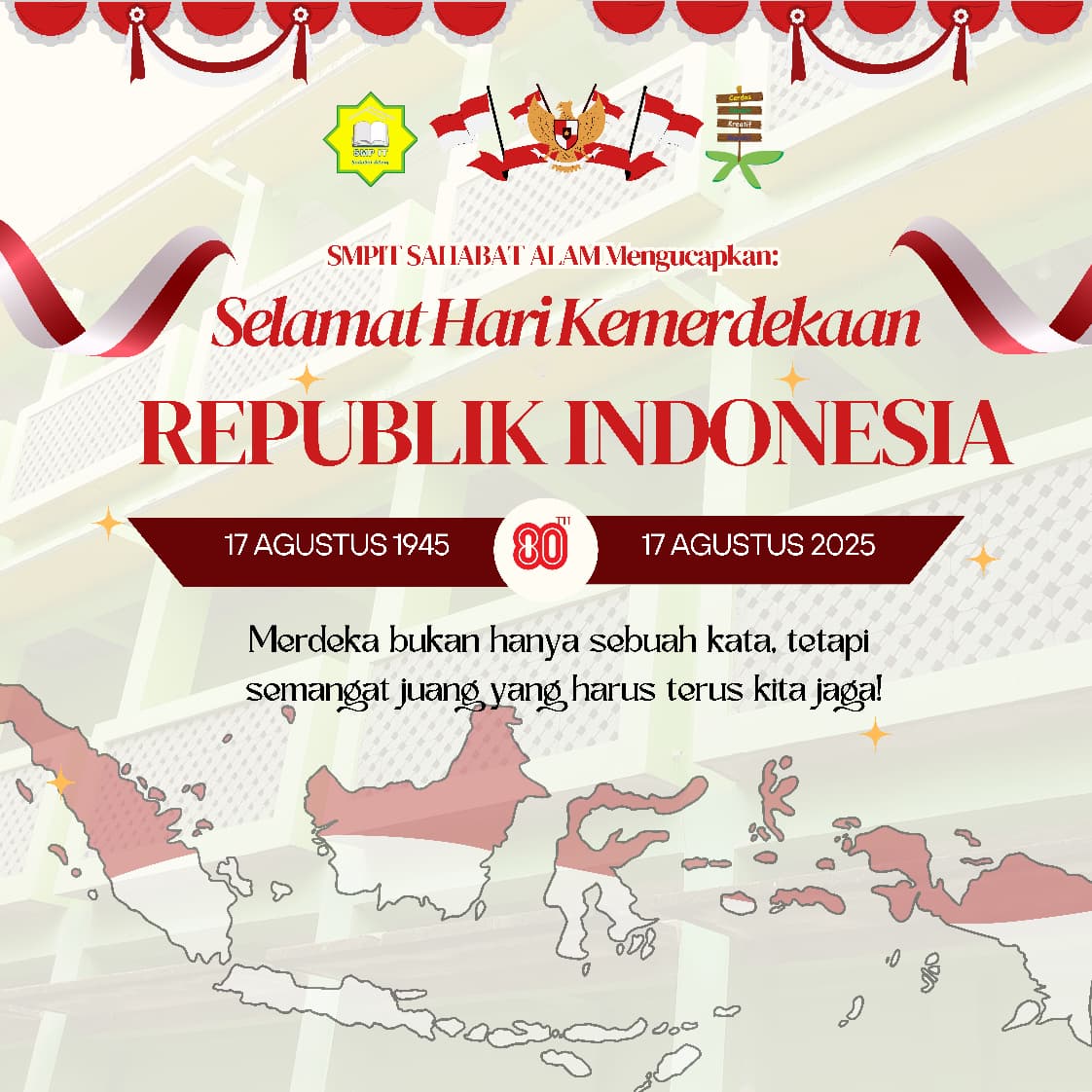 “Dirgahayu Republik Indonesia ke-80. Semoga semangat kemerdekaan terus menyala dalam jiwa anak-anak bangsa. Yayasan Insan Harapan Palabuhanratu bersama SMPIT Sahabat Alam berkomitmen membangun generasi yang kuat dalam ukhuwah, kokoh dalam nilai, dan siap menjadi pelita bangsa. Karena kami yakin, Indonesia akan semakin maju jika pendidikan dan persaudaraan menjadi tiang utamanya,” ungkapnya.
