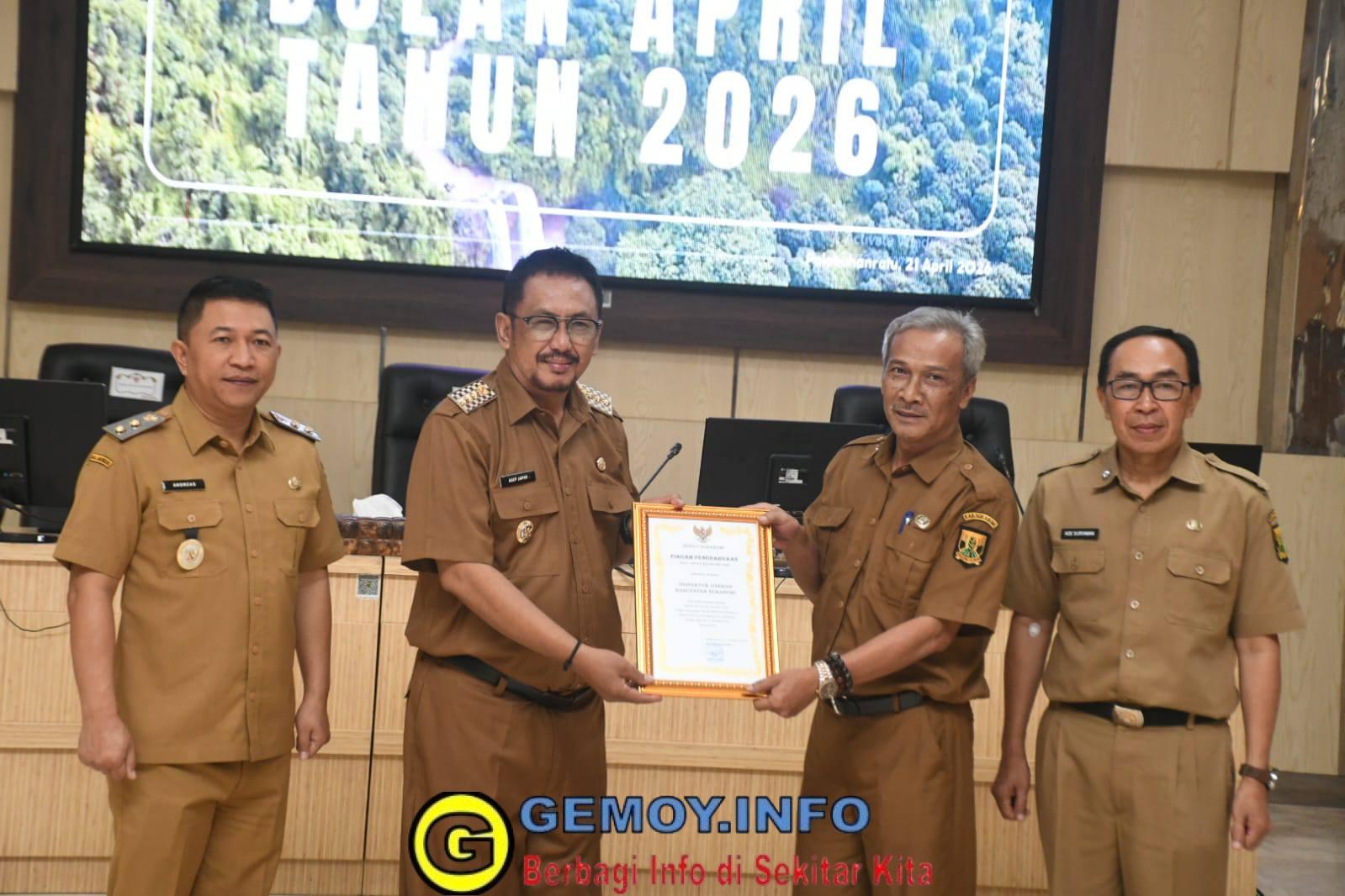 Sukabumi – Bupati Sukabumi H. Asep Japar memimpin Rapat Dinas Bulan April 2026 di Aula Sekretariat Daerah Kabupaten Sukabumi pada Selasa (21/4/2026). Rapat dipandu oleh Sekretaris Daerah H. Ade Suryaman dan dihadiri Wakil Bupati H. Andreas, kepala perangkat daerah, asisten daerah, staf ahli, kepala bagian, serta para camat se-Kabupaten Sukabumi. Dalam kesempatan tersebut, Bupati bersama Wakil Bupati menyerahkan penghargaan kepada sejumlah perangkat daerah atas kontribusi mereka dalam meningkatkan Indeks Reformasi Birokrasi, serta sertifikat akreditasi laboratorium milik Dinas Lingkungan Hidup sebagai bentuk peningkatan kualitas layanan publik.